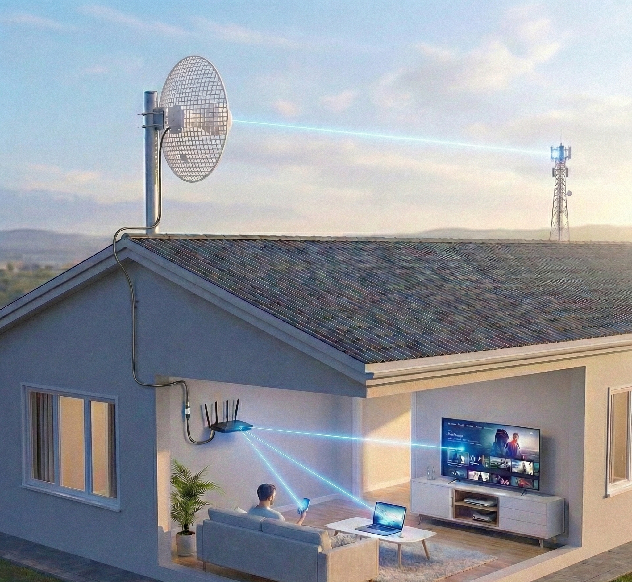 بعد معالجة الإشارة وتثبيتها، يقوم الجهاز بتحويل الاتصال إلى شبكة يمكن توزيعها داخل الموقع عبر منفذ الإيثرنت بسرعة 2.5Gbps. وبهذا يصبح الإنترنت المستقبَل من البرج متاحًا للاستخدام داخل المنزل أو المنشأة.